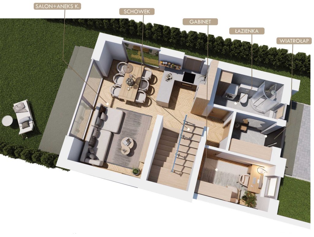 Każdy segment ma powierzchnię ok. 92 m² i został zaprojektowany z myślą o funkcjonalności i wygodzie. Na parterze znajduje się przestronny, jasny salon z aneksem kuchennym i wyjściem na ogród, gabinet, łazienka oraz pomieszczenie gospodarcze. Na piętrze – trzy sypialnie, łazienka i garderobaco zapewnia komfortowe warunki dla całej rodziny.